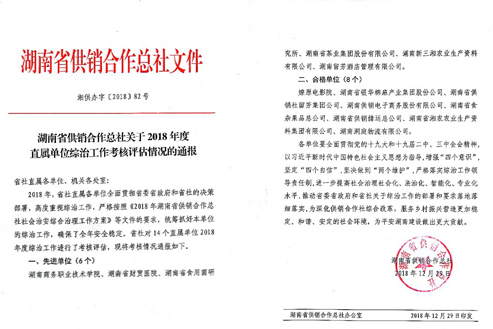 本网讯  日前,从湖南省供销合作总社传来喜讯,我校被评为湖南省供销合作总社直属单位“2018年度综治工作考核评估先进单位”。