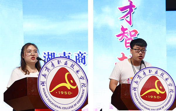 ▲16统计与会计核算3班刘宇娟、16软件技术4班秦越分别作为毕业生代表上台发言。