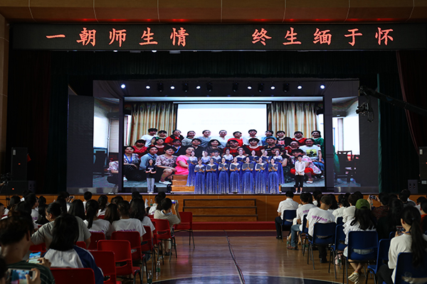 ▲12名退役复学的省级优秀毕业生上台向我校教职员工代表献上鲜花表示感谢。