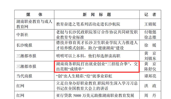 本网讯 日前,湖南省教育厅、湖南省人力资源与社会保障厅联合下发文件通报表彰湖南省第四届职业教育宣传活动周优秀新闻作品,其中《三湘都市报》以“湖南商务职院打出就业创业‘三招组合拳’,交出亮眼‘成绩单’”为题报道我校创业就业工作的新闻荣获三等奖。