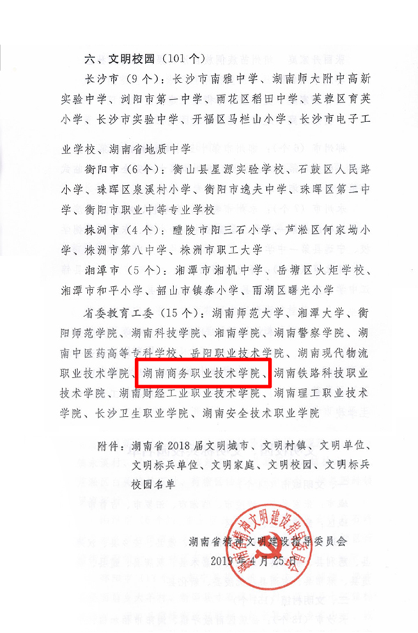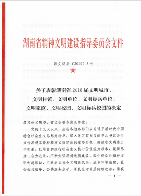 本网讯 (通讯员 胡颖) 日前,湖南省文明委颁发《关于表彰湖南省2018届文明城市、文明村镇、文明单位、文明标兵单位、文明家庭、文明校园、文明标兵校园的决定》(湘文明委〔2019〕3号)文件,授予我校“湖南省文明校园”称号?! ?/div>