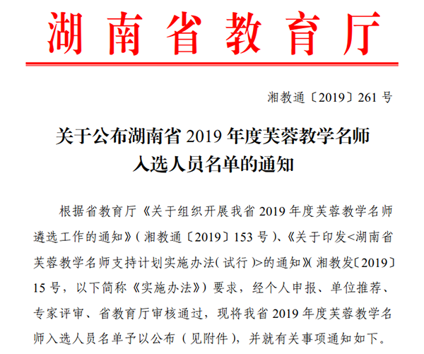 本网讯 近日,湖南省教育厅发布了《关于公布湖南省 2019 年度芙蓉教学名师入选人员名单的通知》(湘教通〔2019〕261号),经个人申报、单位推荐、专家评审、省教育厅审核通过,我?;蒲怯罱淌谌胙『鲜?2019 年度芙蓉教学名师,聘期自2019年9月算起,支持周期为3年。据悉,此次全省共评选出99名芙蓉教学名师,其中高职院校仅有15人入选,这是对我校近年来积极开展人才培养工作的充分肯定。