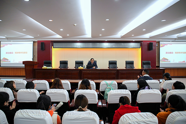 周忠新从“讲政治是马克思主义政党的根本要求”、“以政治建设为统领,扎实推进全面从严治党”、“党的政治建设是一个永恒课题”三个维度全面讲述了政治建设的重要性和必要性。他指出,旗帜鲜明讲政治是马克思主义政党的根本要求,注重党的政治建设是我们党的优良传统和历史经验,具有很强的现实针对性。“不讲政治,犹如蒙眼走路,掉进陷阱、误入歧途是迟早的事”,周忠新强调,作为当代大学生要不断加强马克思主义理论学习,不断提高理论水平,从科学理论中汲取真理支撑和思想力量,切实增强思想自觉、政治自觉、行动自觉,始终在大是大非面前保持政治清醒,时刻以“新时代新使命新担当新作为”作为自己的座右铭,为新时代中国特色社会主义事业奉献热血青春。