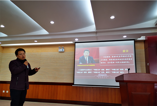黄秋生教授从“中国之治的时代之镜、成功之匙、当下之思”三个方面解读了全会重要精神。他从世界政治格局、经济重心、科技进步、全球化进程等方面的变化入手,充分论证了世界正经历百年未有之大变局;在此基础上分析了中国依赖于制度优势与威力,实现了经济快速发展和社会长期稳定的“两大奇迹”;通过国际形势与格局的理性、生动的分析,让与会者充分认识到坚持和完善中国特色社会主义制度、推进国家治理体系和治理能力现代化的重大意义?;平淌诤粲醮蠹易既钒盐占岢趾屯晟浦泄厣缁嶂饕逯贫?、推进国家治理体系和治理能力现代化的总体要求、总体目标和重点任务;切实提高自身能力,努力拼搏,为确保全会确定的各项目标任务全面落实到位贡献自己的力量。