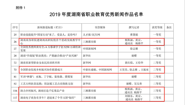 12月23日,湖南省教育厅公布了《关于2019年度湖南省职业教育优秀新闻作品、特别贡献奖的获奖通报》,揭晓了2019年度湖南省职业教育优秀新闻作品名单,我校4篇参赛作品分获优秀新闻作品一等奖、二等奖和三等奖两项。