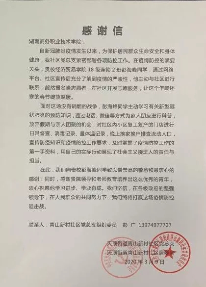 日前,彭海峰同学就读的湖南商务职业技术学院收到了天顶街道青山新村社区居委会发来的感谢信,对彭海峰为抗击疫情所作出的努力致以崇高的敬意和衷心的感谢。(通讯员方嘉成)