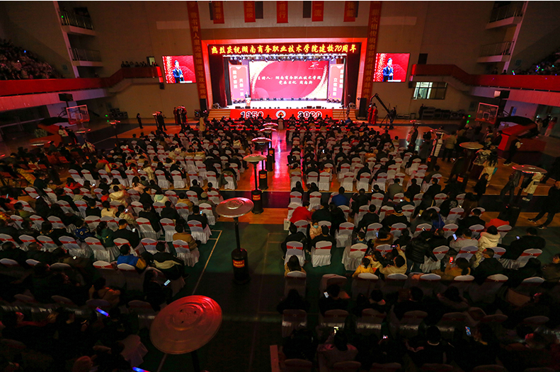 晚7点,在激昂的国歌声中,湖南商务职业技术学院办学70周年成果汇报会在体育馆拉开帷幕。党委书记周忠新代表学院向莅临大会的各位领导、各位校友、各合作企业与兄弟单位表示热烈的欢迎,向70年来为学院改革创新发展作出贡献的老领导、老同志和所有教职员工致以崇高的敬意。同时,周忠新喊话各地校友,“不论何时,母校始终在你们身后,希望你们?;丶铱纯?rdquo;。
