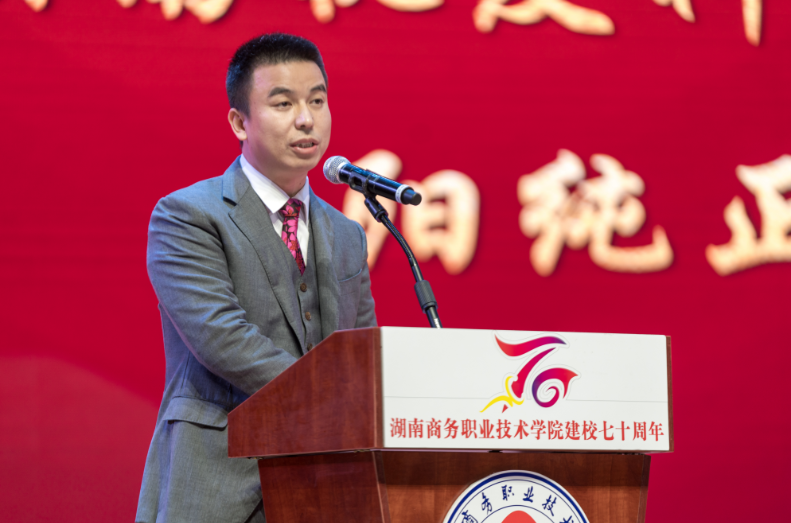 湖南机友科技有限公司CEO阳纯正代表校友向母校70周年华诞表示祝贺。他深情的感慨,“离开母校已有13个寒暑,今天重返母校倍感亲切和激动,满怀感恩和祝福。在商务职院的求学生活经历永远是我生命中最珍贵的青春财富,母校永远是我终身誉恋的精神家园。”阳纯正还倡议成立一支专投商务学子的创业基金,为商务后起之秀的创业提供一个力所能及的平台。