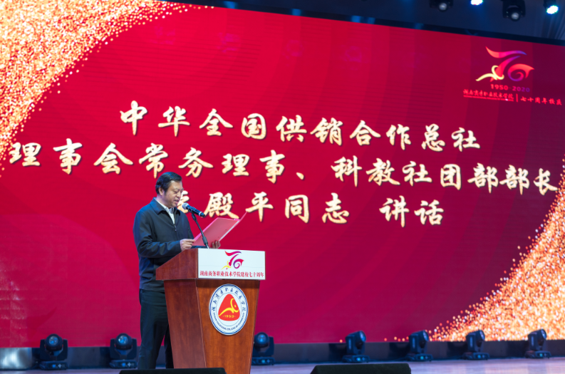 李殿平指出,湖南商务职院由干训班发展成为今天的省卓越高职院校、全国供销合作总社示范性高职院校,为地方经济建设尤其是行业发展做出了重大贡献。供销系统职业院校,是推动供销合作事业发展的一支重要力量。李殿平希望,学院以七十周年校庆为新起点,着力打造高水平专业群,切实提高办学质量;加强师资队伍建设,着力提升立德树人水平;促进职业教育资源整合,进一步加大紧缺人才培养力度,为服务乡村振兴、加快农业农村现代化、全面建设社会主义现代化国家作出新的更大贡献。