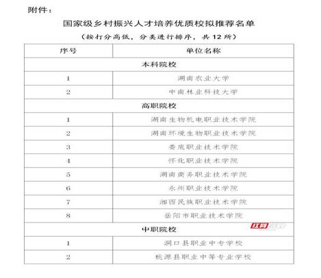 日前,从湖南省农业农村厅公示信息《乡村振兴人才培养优质校公示》获悉,包括湖南商务职业技术学院在内的12所学校,拟作为国家级乡村振兴人才培养优质校被推荐至农业农村部教育部。
