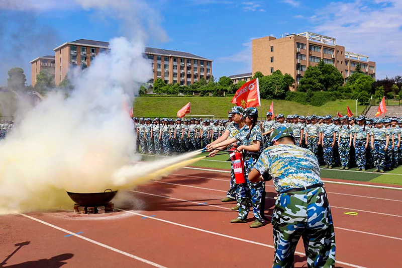 在田径场,可以看到模拟着火点已经燃起熊熊大火,现场由10名同学组成应急灭火小队,按照“一提、二拔、三对准、四喷射”对现场火灾进行扑救。该灭火小队成员均经过赛孚城防灾应急体验馆教官培训考核,具备处置初期火灾的能力和掌握常用消防器材的使用方法。