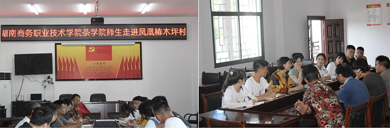 椿木坪村距离凤凰县城21公里,毗邻长潭岗水库,是一个“水在山脚流、田在山上旱”的典型干旱村落,以种植玉米、红薯等传统农作物为主,基础设施较少,主导产业贫乏。该村共203户,860人,目前在村137人,村中的青壮年劳动力均外流。2018年该村结合实际,抓住建立长潭岗万亩茶文化旅游观光概念园建设的机遇,以种植毛尖、竹叶青品种的茶叶为主。2019年开始专种黄金茶毛尖,但产量不高,缺乏种植和生产技术。由于没有优势资源并且缺乏人力资源,椿木坪村遇到很多发展难题。一路随行指导的营销界专家王娜玲教授在与该村村长和第一书记交流时提出以下几点建议:一要学习生产技术,加强专业指导;二要引进资源投资,打造规模生产;三要明确市场定位,开拓市场地位。志愿者们还根据该村的现实问题,提出让椿木坪村村民提供茶叶成品,拿到湖南商务职业技术学院创业园至妙堂工作室进行线上电商抖音直播销售以及线下形象店销售。期间志愿者还访谈了两位茶叶种植农户,他们表示目前对政府支持的茶叶产业的发展比较满意,从开始种植茶到现在,生活条件也逐渐变好了起来,政府对村里的改造也多了很多。