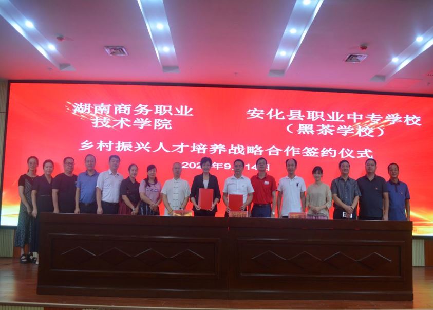 我院人员在伍亮、刘迪凡等领导陪同下,参观了安化县职业中专学校(安化黑茶学校)校园,了解学生学习与生活环境。参观完毕,双方举行了隆重的乡村振兴人才培养战略合作签约仪式。两校达成一致协议,将携手推进中高职衔街五年制人才培养工作,为乡村振兴事业输送专业人才。