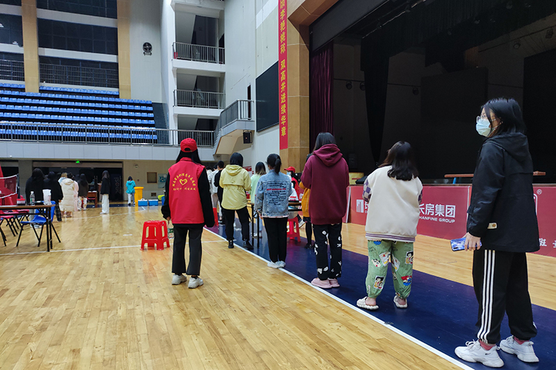 10月25日晚11点,在湖南商务职业技术学院体育馆内依旧灯火通明,这是一个特殊的夜晚,1万多名学生和500多名教职员工全天候排队有序接受核酸检测,10组医护人员和70余名志愿者昼夜轮流值守现场,让我们见证了何为中国速度。