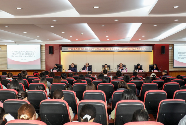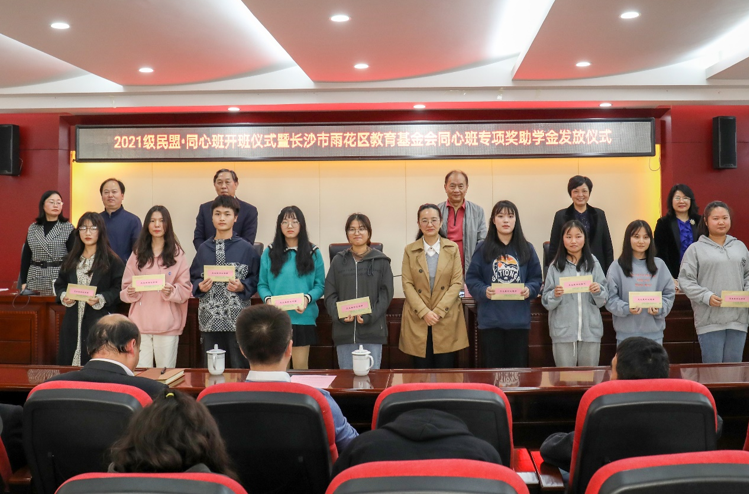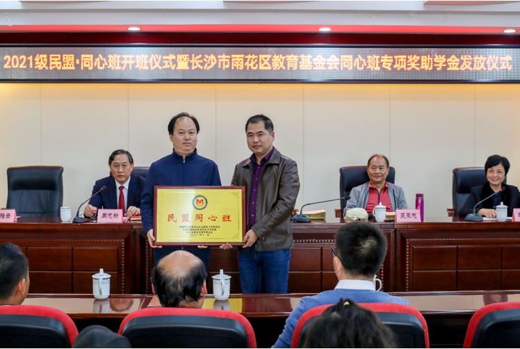 开班仪式上,民盟省委会社会服务处处长陈雅云为2021级民盟·同心班授牌, 省政协副秘书长、民盟省委会专职副主委胡颖为雷莎莎等20名同学发放奖学金,民盟省委会社会服务工作委员会主任、长沙市雨花区教育基金会理事长吴承志为唐再霞等20名同学发放助学金。学生代表纷纷表示,一定心怀感恩,奋发图强,立志成才,将爱心不断传递下去。