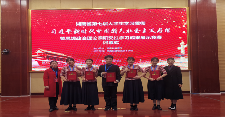 12月5日,湖南省第七届大学生学习贯彻习近平新时代中国特色社会主义思想暨思想政治理论课研究性学习成果展示竞赛决赛在湖南交通职业技术学院落下帷幕。我院马克思主义学院高莉、邓艳君老师指导的研究性学习小组——20级茶艺与茶叶营销1班李智源、刘诗洋、朱佳慧、彭文艳、郑仪五位同学,以作品《以青春之笔 共绘新时代茶•乡融合画卷》斩获高职高专组一等奖第一名。