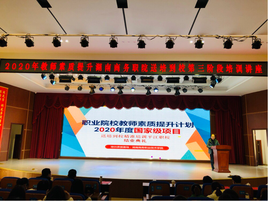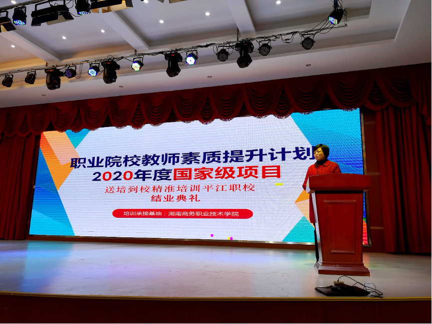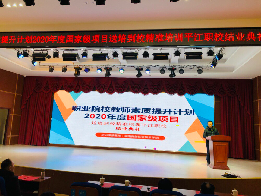 (通讯员 曾鸣 周训菊)2022年1月13日上午,职业院校教师教育教学素质提高计划2020年国家级项目——送培到校精准培训平江县职业技术学校培训班举行结业典礼。结业典礼主题“人人出彩,技能强国,推进职业教育高质量发展”引发热烈讨论。湖南商务职业技术学院院长李定珍、教务处长毛政珍、电子商务学院院长曾鸣、电子商务学院副院长袁鑫、平江县职业技术学校副书记李积良、副校长李殿龙及全体参训学员出席了结业典礼。平江县职业技术学校副校长李清龙主持结业仪式。