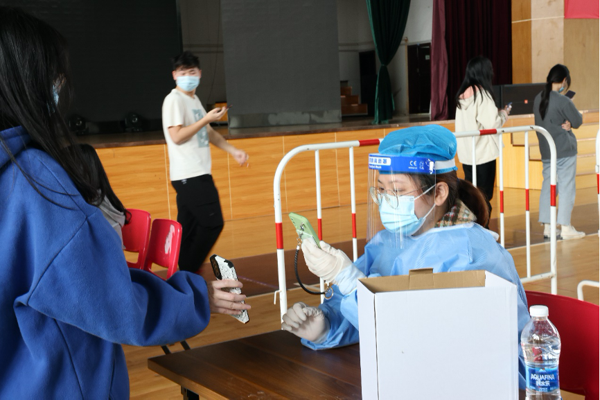 “请先出示健康码,录入信息后再往前排队,不要拥挤,排队注意保持一米距离。”“啊,请把嘴张开,很快就可以做完的”10个信息录入点,10个核酸采样点,辅导员老师主动担任信息录入的工作,和医护人员一起,一次次的奋战在抗疫一线。“医护人员很温柔”“谢谢!工作人员也辛苦了!”同学们纷纷向医护人员和志愿老师表示感谢。7轮全员核酸检测工作,数十名教职工主动参与到志愿服务工作。