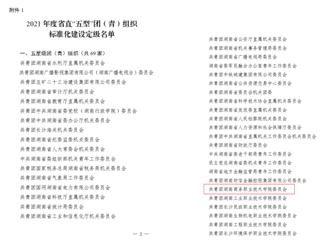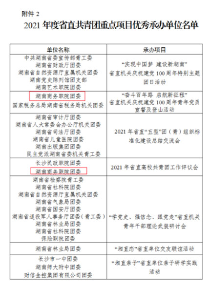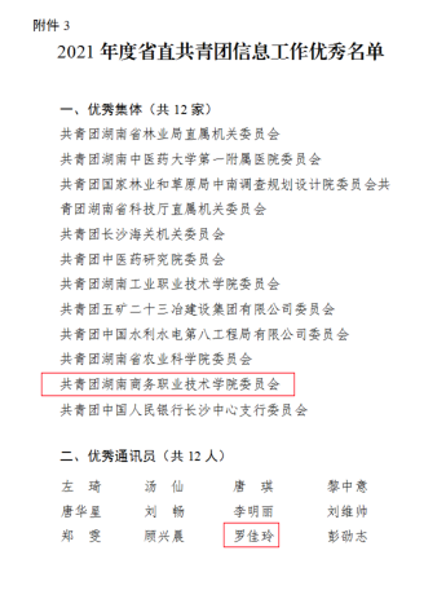 近日,湖南省直团工委下发了《共青团湖南省直属机关工作委员会关于2021年度省直“五型”团(青)组织标准化建设结果的通报》(湘直团〔2022〕1号),学院团委荣获“五星级团(青)组织”、“2021年度省直共青团重点项目优秀承办单位”、“2021年度省直共青团信息工作优秀单位”等4项荣誉称号,罗佳玲同志荣获“2021年度湖南省直共青团信息工作优秀通讯员”称号。