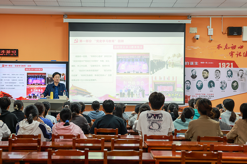 廖志刚从“党史学习教育”回顾、弘扬伟大建党精神、争做新时代的合格党员、喜迎二十大永远跟党走,这四个部分进行深入解读,带领同学们共同感受中国共产党一百年奋斗历程所取得的辉煌成就。他指出,实现中华民族伟大复兴是百年辉煌党史的主题,是理解中国共产党人初心使命的枢纽。在不同历史时期,中国共产党人经过艰苦奋斗,形成了不同的崇高革命精神,这些精神是我们党和中华民族的宝贵精神财富,也是激励全体人民不断前进的重要精神力量。