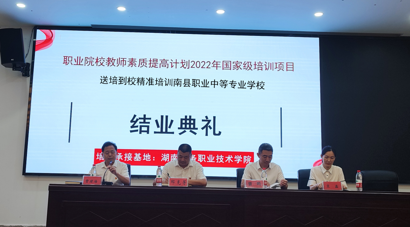 2022年7月19日,职业院校教师教育教学素质提高计划2022年国家级项目——送培到校精准培训南县职业中等专业学校培训班举行结业典礼。湖南商务职业技术学院电子商务学院院长曾鸣、副院长袁鑫、南县职业中等专业学校党总支书记、校长邓克芳、副校长曹建海、副校长郭创乾、教学科主任蔡春辉及全体参训学员出席了结业典礼。南县职业中等专业学校副校长曹建海主持结业仪式。