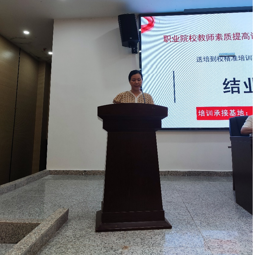 “感谢为我们学习和成长付出心血的领导、专家和老师们,感谢默默陪伴我们的班主任、班长,当然也感谢克服重重困难、努力学习的我们自己。”结业典礼上,优秀学员王亚丰老师代表全体学员作了总结发言。王亚丰老师首先对商务职院的送培教师团队的辛勤付出表示感谢,同时也感动于学员在学习中的认真和倾情投入,最后她代表所有学员表示“驽马自知征途远,不须扬鞭自奋蹄”,结业典礼不是结束,而是一个新的开始,在这次培训中接触到了课程思政、课程建设、教学设计等各方面的信息,培训结束后还将继续努力,将所学知识应用到实践,更好地提高教学能力。