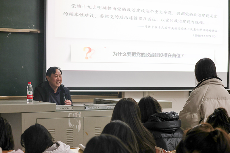 为什么要全面从严治党?为什么十八大以来管党治党宽松软状况得到根本扭转?周忠新围绕“全面从严治党”主题,带领学生回顾了党的十八大以来在全面从严治党方面采取的重要举措,通过生动的案例、详实的数据系统回答了全面从严治党的必要性和重要性。他指出,从严治党是马克思主义政党的政治优势,是实现民族复兴的根本保证,是决定党兴衰成败的关键因素。面向未来,周忠新勉励青年学子时刻把纪律和规矩挺在前面,牢固树立大局意识和全局观念,把个人的学习成长与时代的发展相融合,永远保持“赶考”的清醒和坚定,以永远在路上的信念和执着,以伟大自我革命引领伟大社会革命,坚持不懈把全面从严治党向纵深推进。