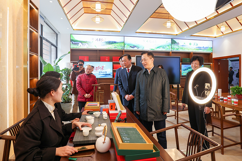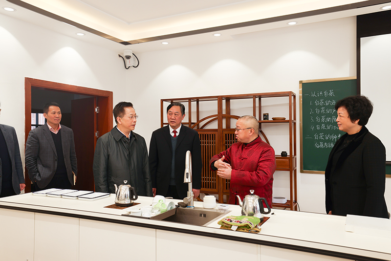 夏智伦一行实地参观了五彩湘茶文化走廊、茶文化室、茶艺室、茶评室、应急指挥中心、思政实践教学中心等地,体验了独具特色的茶文化、湖湘红色文化,了解学院发展规划和校园建设情况,听取学院在基础建设、队伍建设等方面遇到的瓶颈和下一步工作计划,对学院办学特色给予了高度肯定。