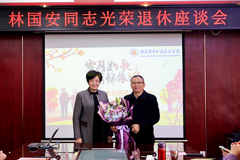 院长李定珍为林国安同志献上鲜花和祝福,表示林国安同志是一位好干部、好同志。任职纪委书记期间,政治站位高、大局观意识强,为学院事业发展严把政治关、政策关、廉洁关,严守底线、红线,营造了风清气正的良好生态。