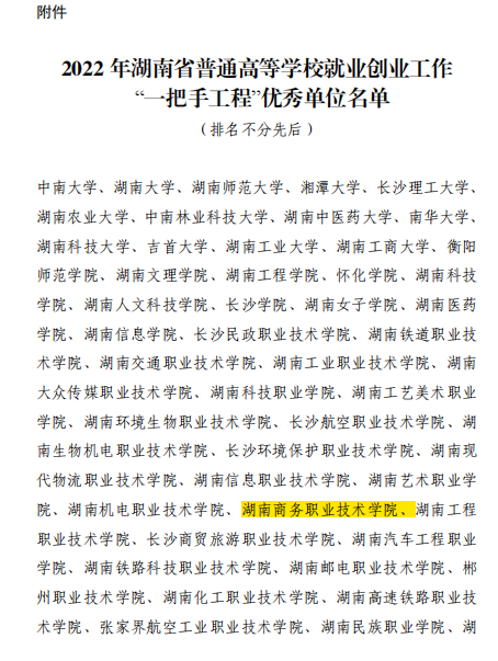 (通讯员 刘芳芳)近日,从湖南省教育厅下发的《关于2022年湖南省普通高等学校就业创业工作“一把手工程” 优秀单位的通报》(湘教通[2023]90号)中获悉,学院被评为2022年湖南省普通高等学校就业创业工作 “一把手工程”优秀单位,这是学院连续五次获评就业创业工作“一把手工程”优秀单位。