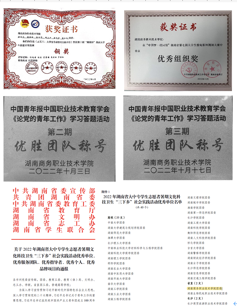 2022年以来,在上级团组织和学院党委、行政的正确领导下,学院团委以习近平新时代中国特色社会主义思想为指导,持续推进学院共青团改革,重点开展了思想引领、组织建设、志愿服务、校园文化建设等工作,在湖南省“挑战杯”大学生创业计划竞赛中斩获三等奖5项;“中国梦·校园情”湖南省第七届大学生微电影短视频大赛中荣获“优秀组织奖”;2022年湖南省暑期“三下乡”社会实践活动中被评为“优秀单位”;2022年度湖南省“青马在线”工作荣获“优秀组织单位”;中国青年报中国职业技术教育学会《论党的青年工作》学习答题活动第二期、第三期均获“优胜团队称号”。