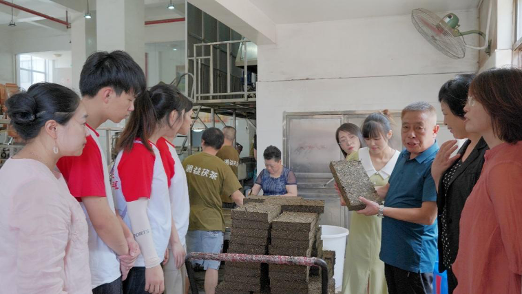 “每一块茶都要有足量的金花,这是十几年几代人的事业与坚持,是技艺与文化的优秀传承。”在湖南省益阳茶厂有限公司,在中国制茶大师刘杏益的带领下,师生们参观了原料仓储、成品仓储、压制车间、金花酵库等,近距离了解黑茶茯砖的工艺和现代化标准化的先进生产技术。刘杏益勉励商务学子们,要深刻感受这股精神,接过接力棒,守正创新,在茶事业、茶产业和茶文化的推进道路上坚守初心、不懈努力。师生们纷纷表示,深深被老一代制茶大师的人格魅力、人文情怀以及工匠精神所感染,将谨记大师“将茶作为事业去做”的谆谆教诲。