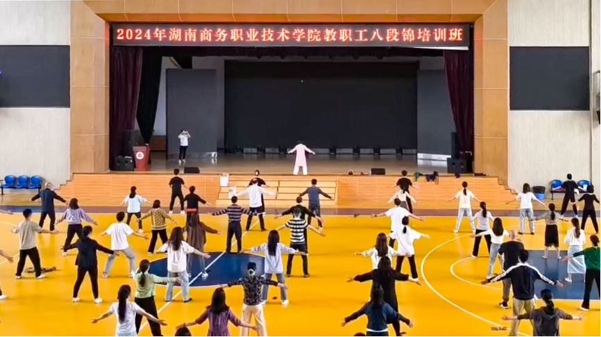 后顶虚领、立项竖脊、沉肩坠肘、两足平踏......4月1日,湖南商务职业技术学院体育馆内,百余名教职员工伴着舒缓的音乐练起了八段锦,缓缓抬手、下腰、提脚,刚柔兼济中尽显八段锦的独特神韵。