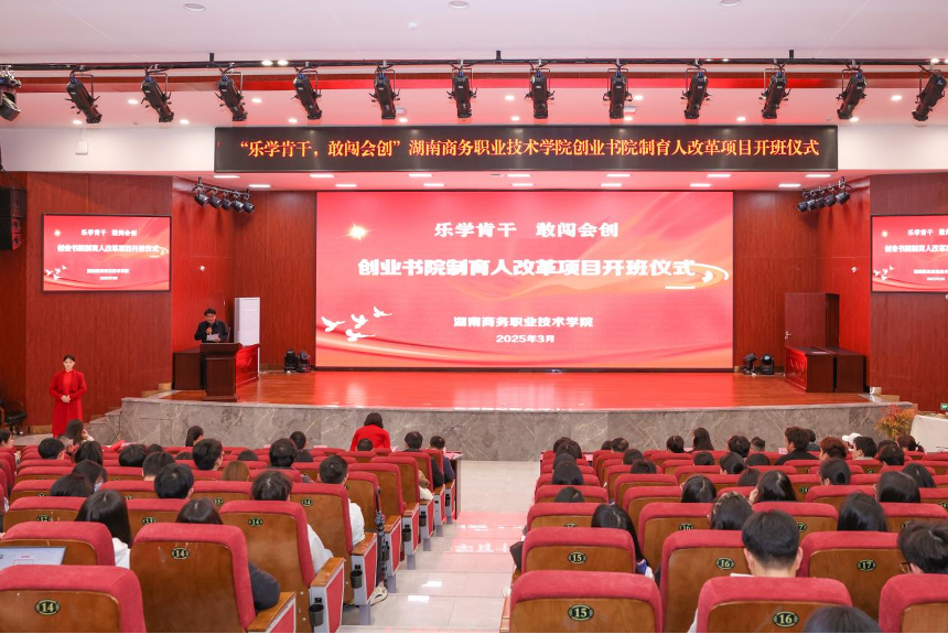 3月11日,湖南商务职业技术学院创业书院制育人改革项目开班仪式举行。作为湖南省内高职院校首个采用书院制模式培养创新创业人才的育人项目,创业书院的成立标志着学院在创新创业教育领域迈出了创新性的一步,为高职院校培养高素质“双创”人才提供了全新范本。党委书记潘军、副院长禹明华及企业家代表、创业导师和首批入选的创业项目团队成员共同见证了这一重要时刻。