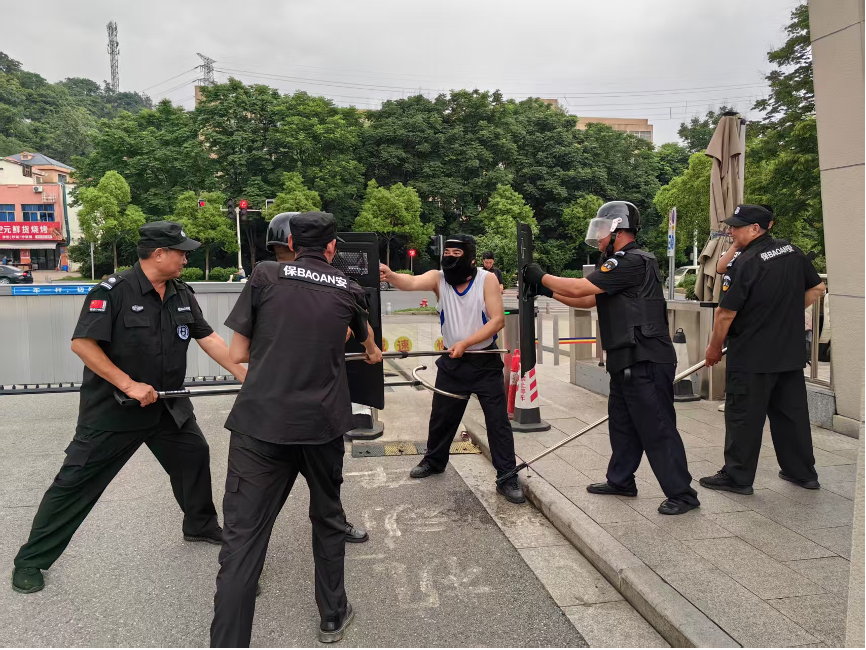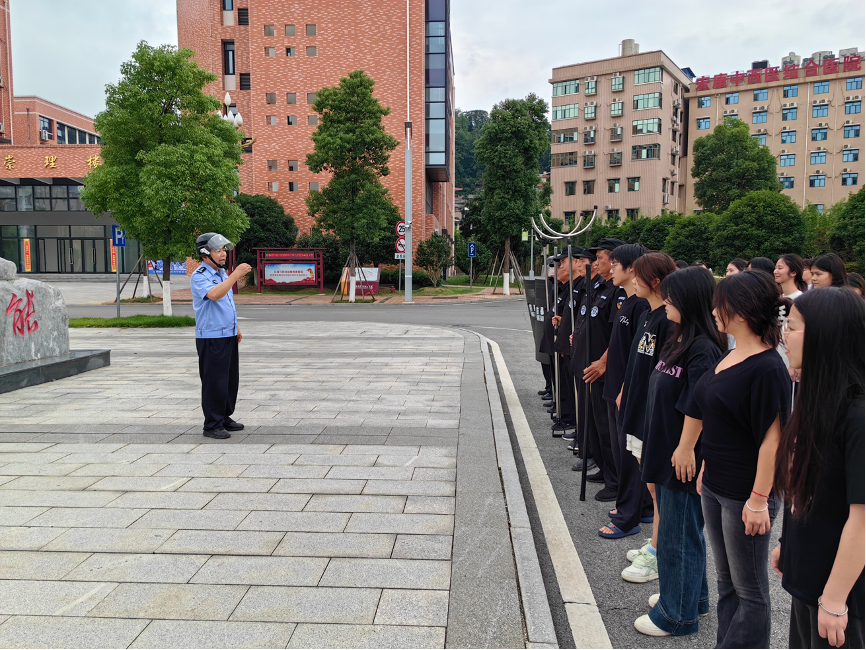 演练紧扣实战需求,设置“器械规范使用”“突发事件处置”“模拟对抗演练”三大环节。吴警官结合校园安保特点,现场演示防暴盾牌、钢叉、抓捕器等器械的操作技巧,详细讲解人员站位、攻防战术及应急协作要点。在模拟对抗环节,安保人员分组演练了“持械暴徒闯入”“可疑物品排查”“人员疏散救援”等场景,学生代表则扮演群众、伤员等角色,全程参与应急处置流程。吴警官针对演练中的薄弱环节进行逐一点评,强调“反应速度、装备应用与团队协作”是守护校园安全的关键。