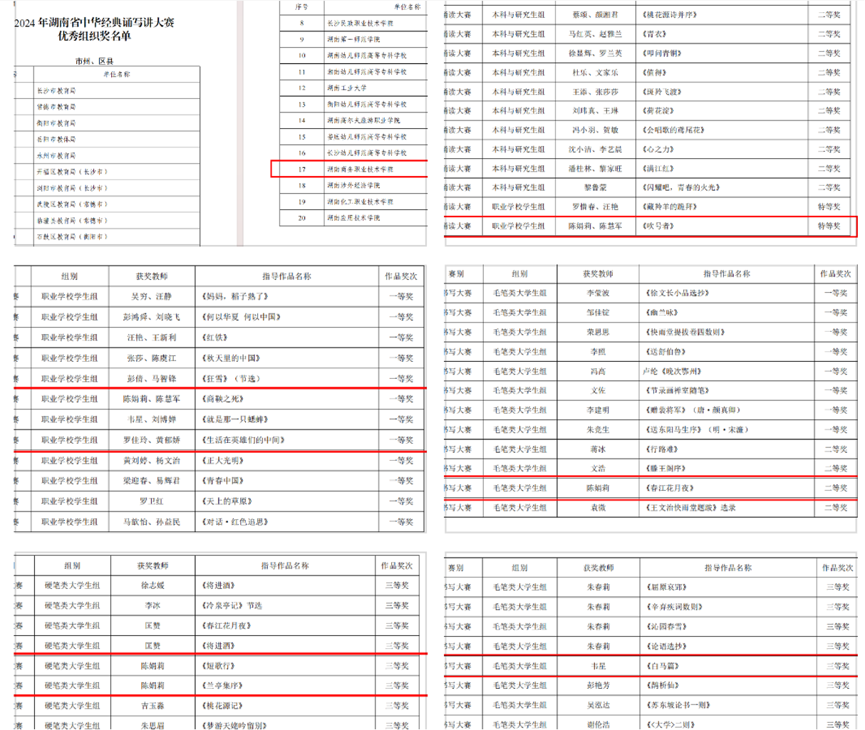 近日,2024年湖南省中华经典诵写讲大赛圆满落幕。在这场以“典耀中华,赓续文脉”为主题的省级赛事中,湖南商务职业技术学院师生以深厚的文化底蕴和出色的表现力,斩获多项大奖,学院获评优秀组织奖,展现了新时代师生传承中华优秀传统文化的卓越风采。