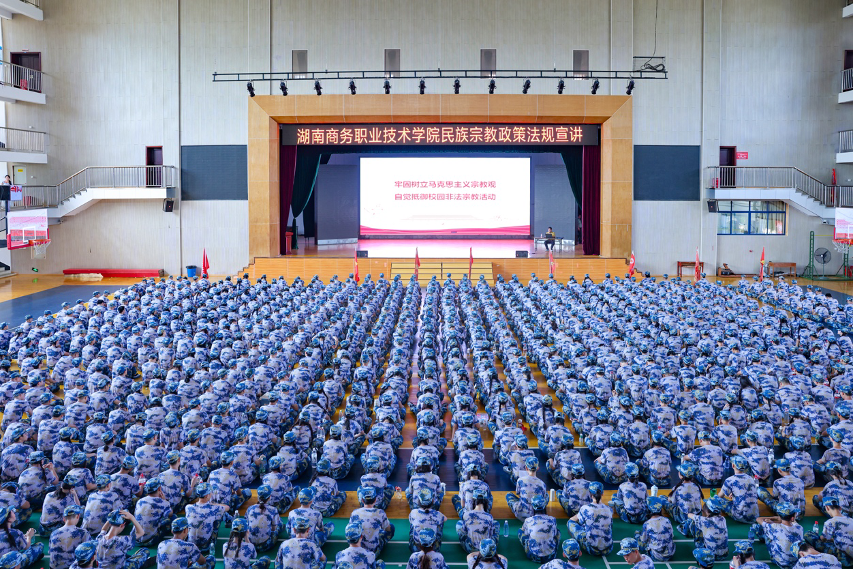 9月17日,学院联合长沙市民族宗教事务局共同举办新生入学专题教育活动。长沙市民族宗教事务局专家应邀走进校园,以“牢固树立马克思主义宗教观,坚决抵制校园非法宗教活动”为主题,为4400余名新生带来了一堂深刻的思想政治教育课。