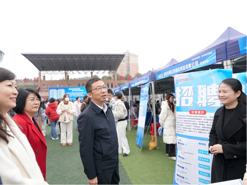 学院党委书记潘军率全体校领导深入招聘会现场,与企业代表亲切交流,了解用人需求与市场动向,并就深化校企协同育人、拓展就业渠道等议题交换意见。校领导还与参会毕业生面对面交谈,鼓励大家树立信心、积极应聘,在实践中定位职业方向。