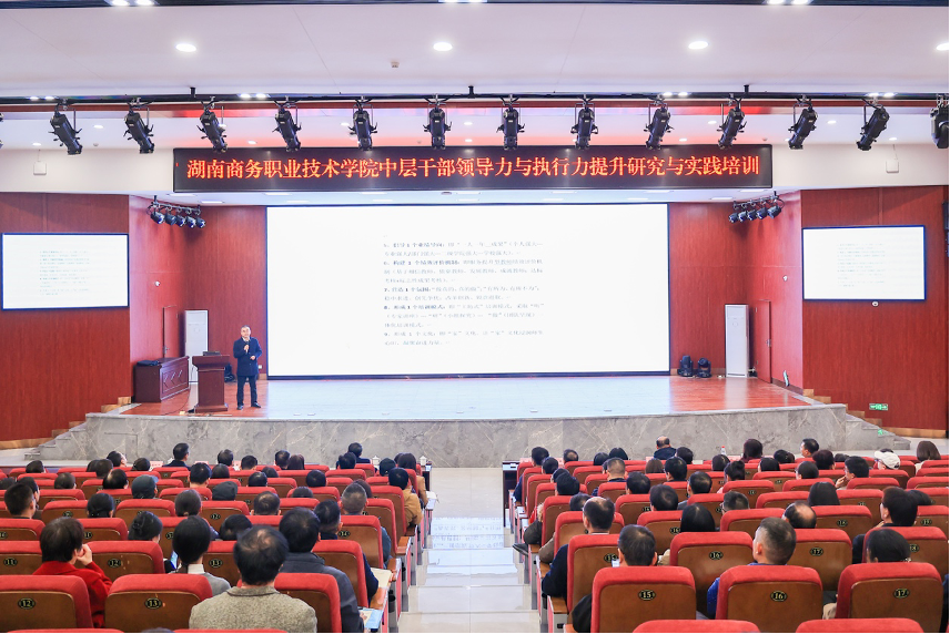 12月16日下午,湖南商务职业技术学院校长李科围绕“中层干部领导力与执行力提升研究与实践”主题,为全体院领导及两校区中层干部作专题讲座。讲座立足学校发展实际,系统阐释办学治校理念,深入剖析领导力与执行力的内涵与提升路径,为学校新时期高质量发展注入强劲的思想动能与行动指南。党委副书记桂诚主持大会。