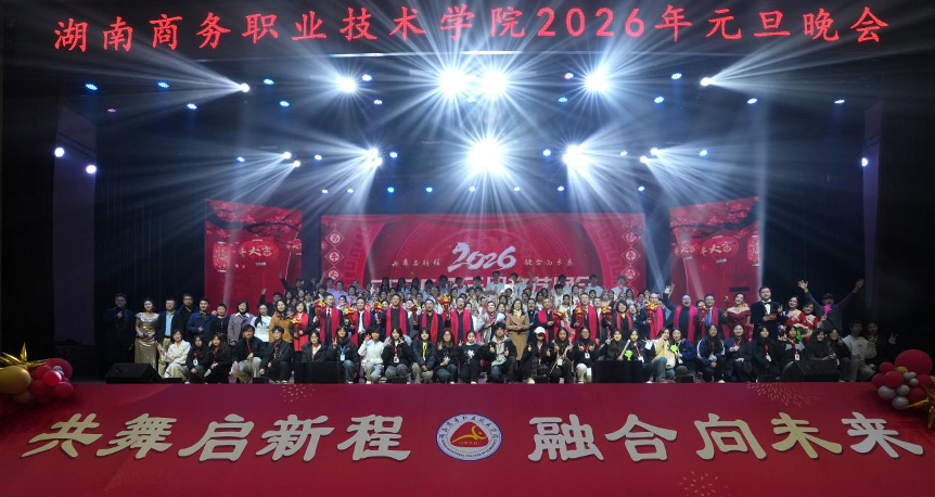 12月30日晚,湖南商务职业技术学院洋溢着喜庆欢腾的节日氛围,“共舞启新程·融合向未来”2026年元旦文艺晚会在师生热切期待中盛大启幕。学校领导、两校区师生代表欢聚一堂,共赏精彩演出,喜迎崭新一年。本次晚会通过湖南教育电视台进行全程现场直播,吸引线上逾万名观众与校友共同观看、互动祝福,凝聚起一场跨越时空的团圆盛会。湖南省教育工会副主席朱冠星、普教部部长肖艺婕及部分校企合作单位代表受邀出席晚会。