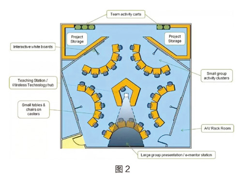由于教师的讲桌和椅子也能移动,就进一步解决了传统固定格局的教室里,后排学生容易分散注意力的缺陷。在整堂课程的教学过程中,通过学生分组或教师位置的改变,更容易激励全体学生的课堂参与。
