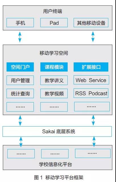 浙江大学移动学习平台以Sakai为基础,对接了教务系统、流媒体系统等浙江大学其他信息化系统,便于学校资源平台信息互通。在移动学习空间提供了多样化的服务,包括用户管理、统计查询、视频讲义等。系统通过Web Service、RSS Podcast等接口,可以对外进一步扩展,定制化开发各种插件,在保证完整的教学流程的基础上,以满足各类教师、各类课程的最大化的个性需求。图1是浙江大学移动学习平台的总体框架图。