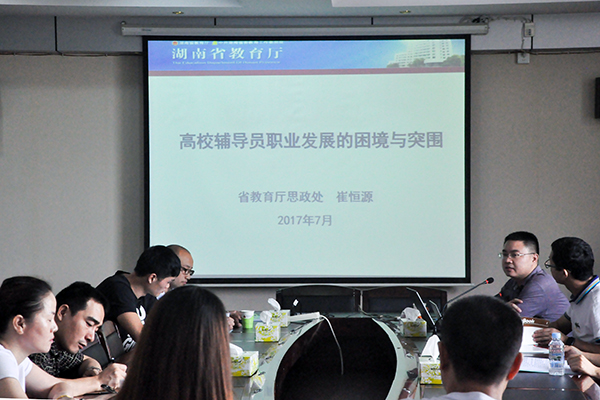 图为省委教育工委宣传部副部长崔恒源作题为《辅导员职业发展的困境及突围》的主题报告
