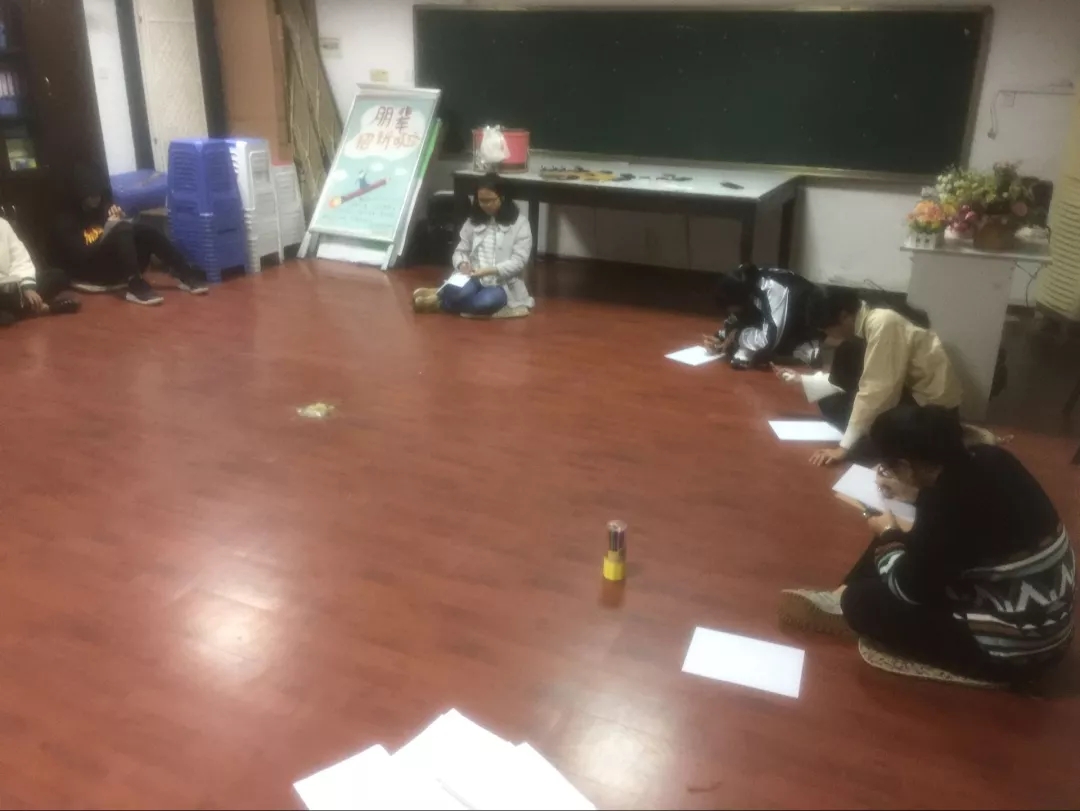 先给大家睹一睹我们的风采,中间这位席地而坐的就是本次团体心理辅导的指导老师,来自心理健康教育中心的钟正亮老师。