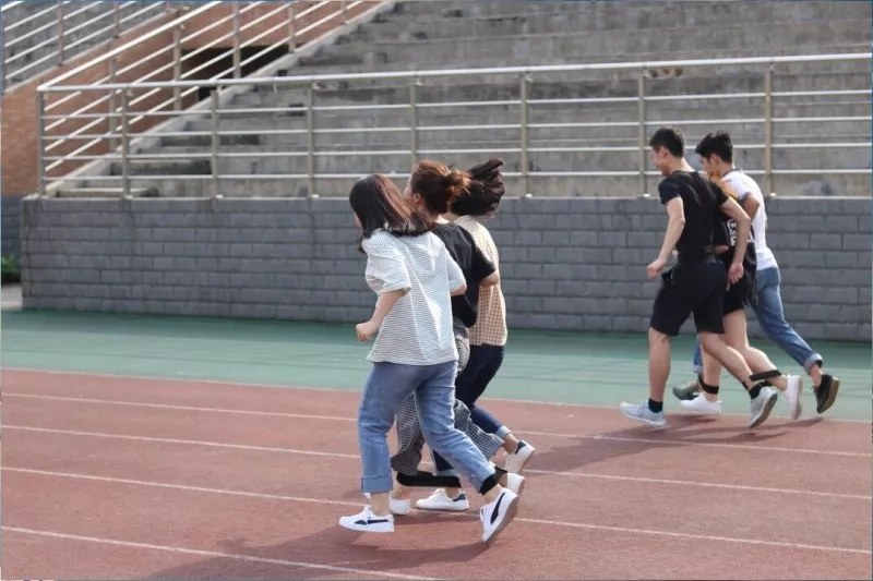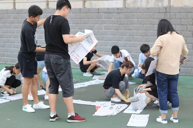 小帅哥:在操场上聚齐了这样一群人,用报纸做成“风火轮”轮前进,在扶持着对方绑腿跑向终点。在欢声笑语中紧凑着围在一团……虽然场面有些尴尬,但是大家硬着头皮在这个活动中玩耍 游戏很是热闹。