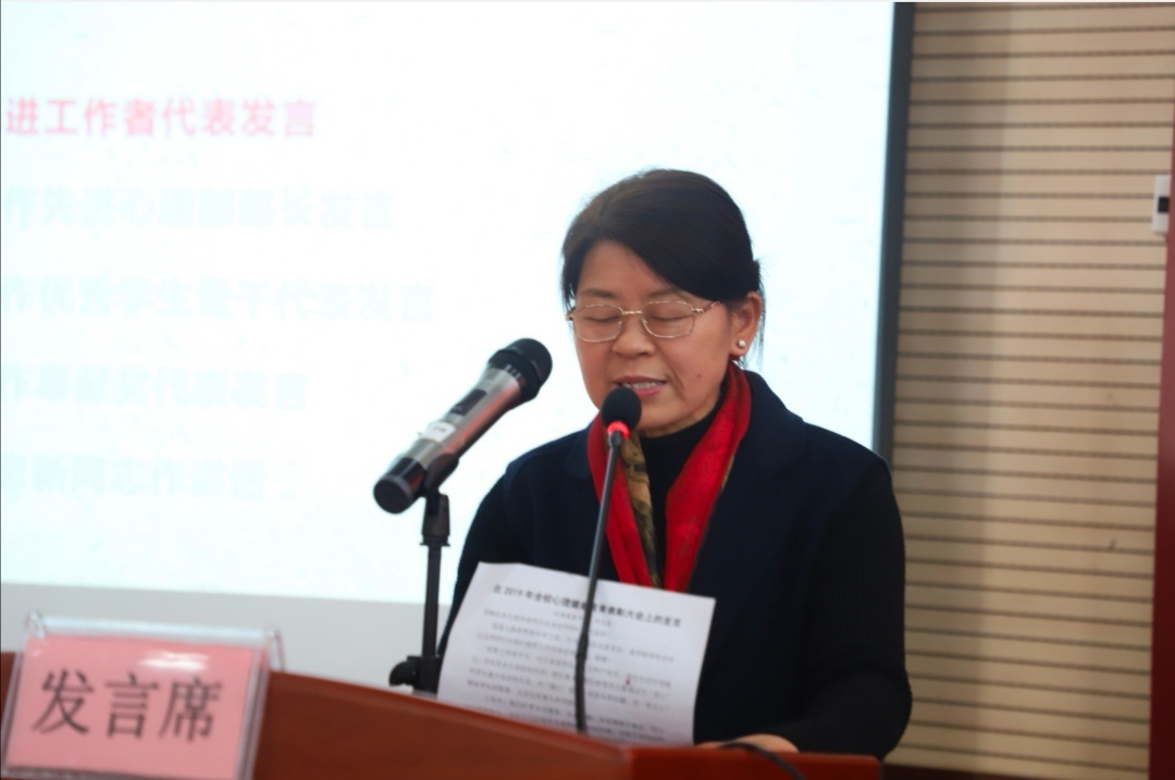 首先由心理健康教育中心主任高明老师作2019年度学生心理健康教育工作总结报告。高老师从心理健康教育,心理健康安全,心理健康活动等多个方面回顾了一年来我校在心理健康工作中取得的成绩,最后还提出了对未来心理健康工作的发展。