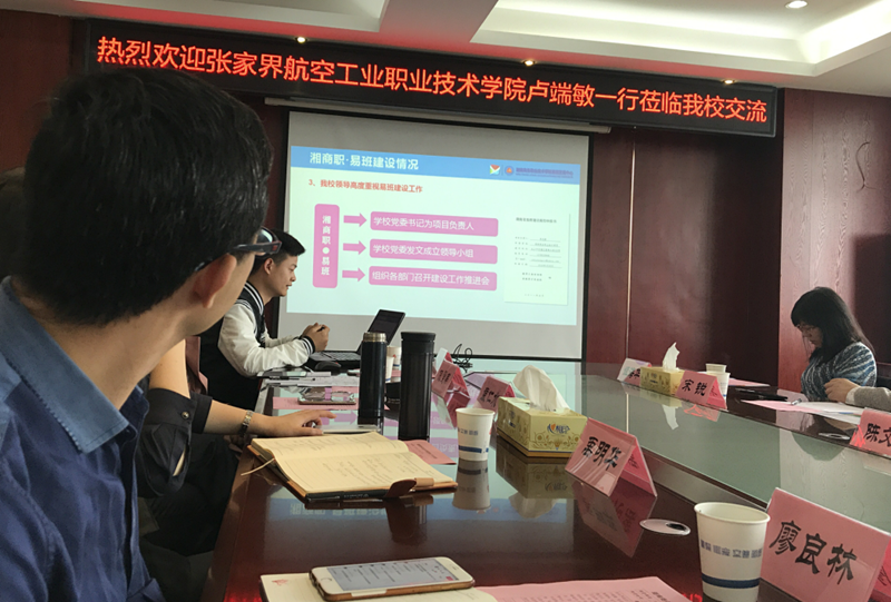 2019年4月23日上午,张家界航空工业职业技术学院卢端敏副院长一行来我??挂装嘟ㄉ杩疾旖涣骰疃?,学校副校长廖良林、禹明华及学生工作部部长、二级学院党总支书记、校易班工作站技术人员、信息中心技术人员等在办公楼523会议室接待考察。