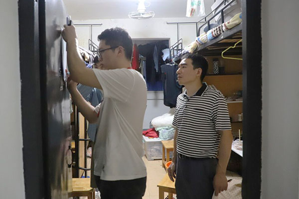“同学请开下门,学工处老师来清点宿舍人数……”7月4日晚10时30分,学工处处长杨明带领陈慧军老师和蔺洋扬老师及全体宿管干部逐栋逐层对学生宿舍进行一次晚归突击检查。