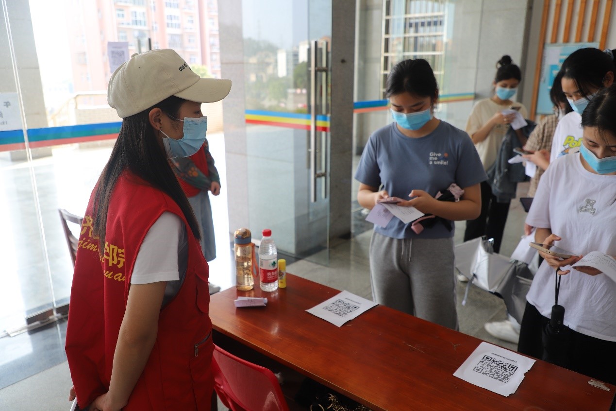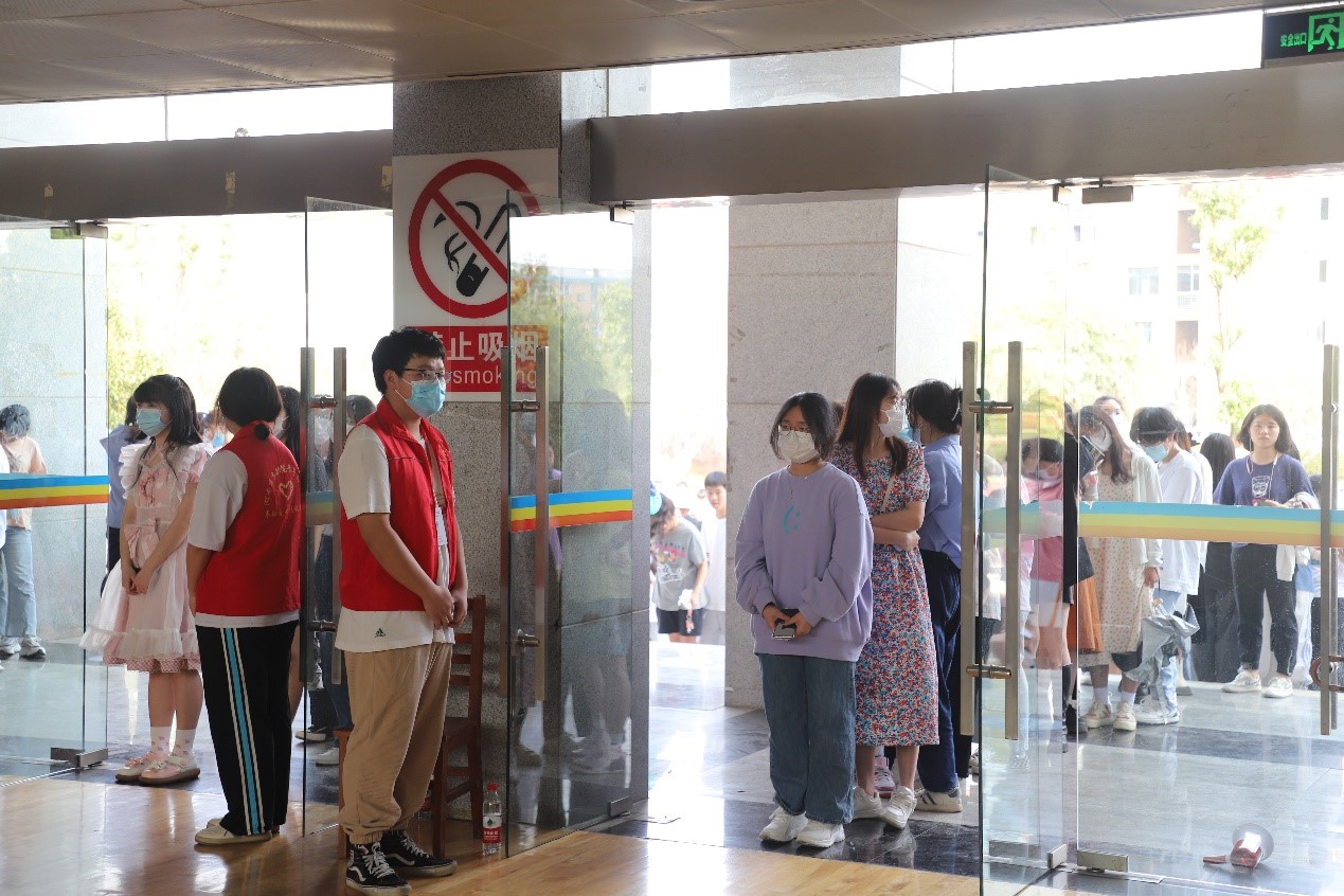 同学们接种完疫苗后,还需拿着“白衣天使”发放的接种证明纸条,在体育馆二楼观众席留观30分钟,确认接种无不良反应后,于二楼大门经守门“红马甲”志愿者确认后扫码离开。