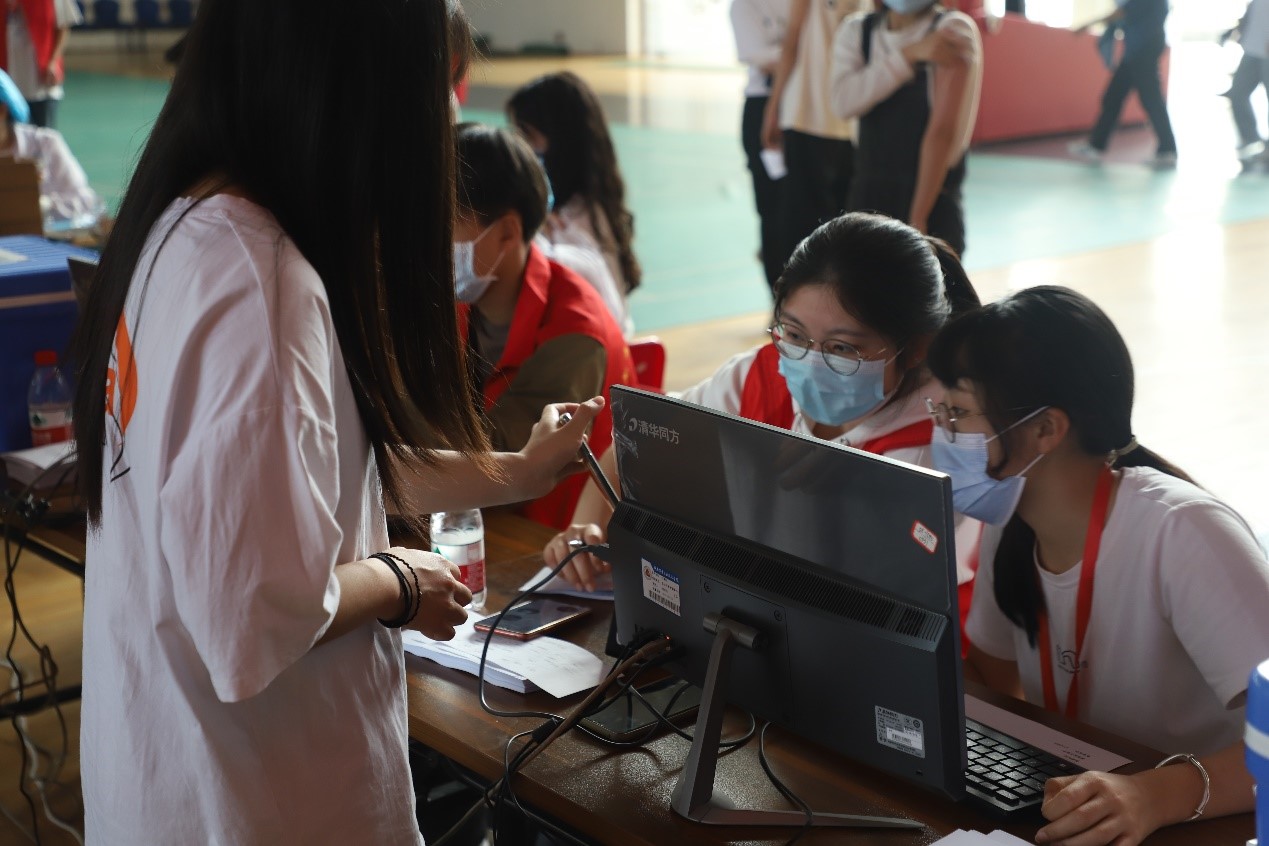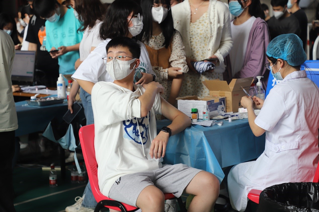 疫苗接种现场,同学们在身穿“红马甲”的志愿者引导下,有序的在体育馆前排队等候,随后分组保持一定距离的进入体育馆,在临时接种台,向录入信息的志愿者出示当天签署的接种预约码,经志愿者扫码录入信息后,撸起衣袖配合着医护人员进行疫苗接种。